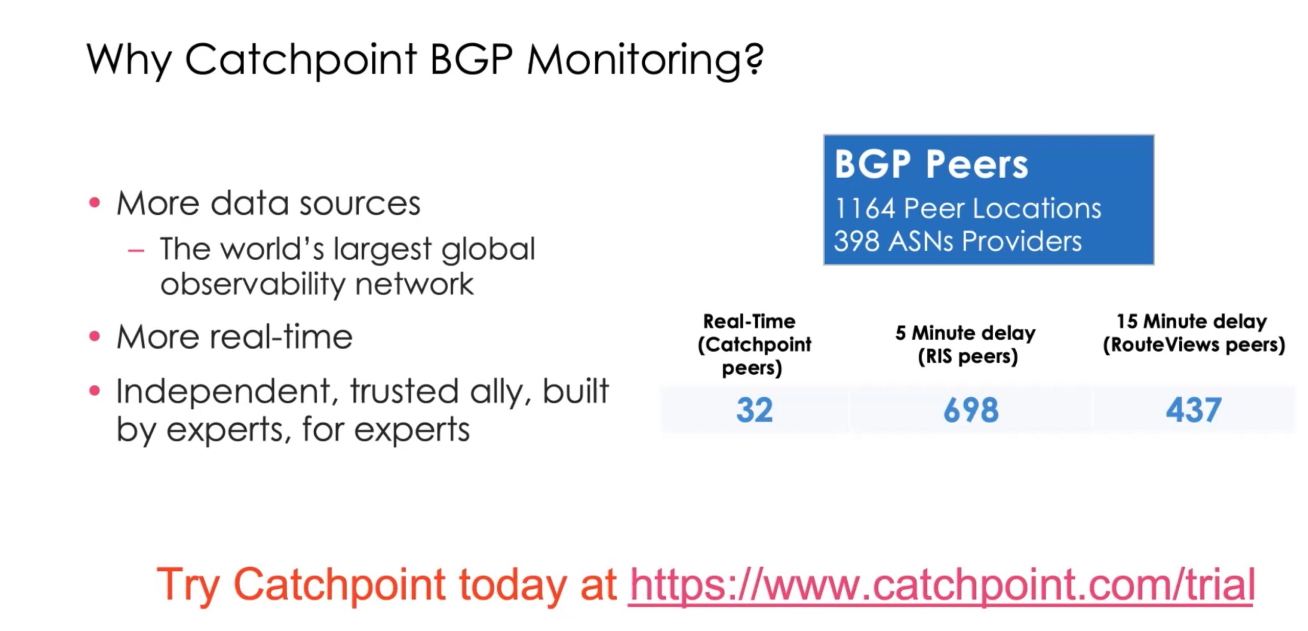 We’ll wrap up with a slide from the video presentation. It pretty much explains itself. Note that Catchpoint has a large number of BGP peers, tracking 398 ASN’s.