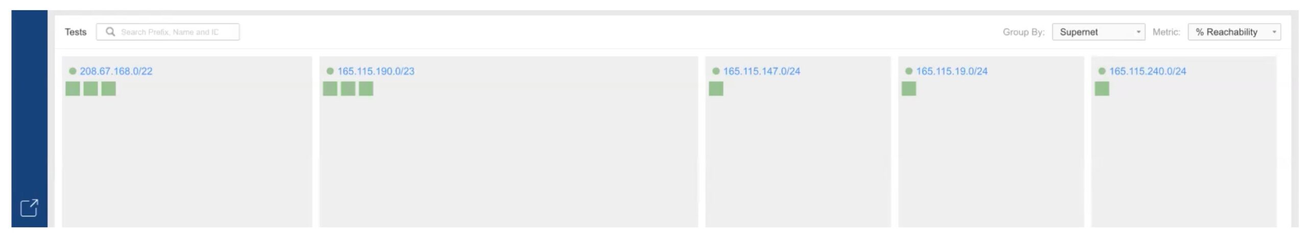 Scrolling down, the next item shown is a summary graphic of tests and status, with a block per prefix. Green is good. This is another way to quickly spot problems (non-green!).