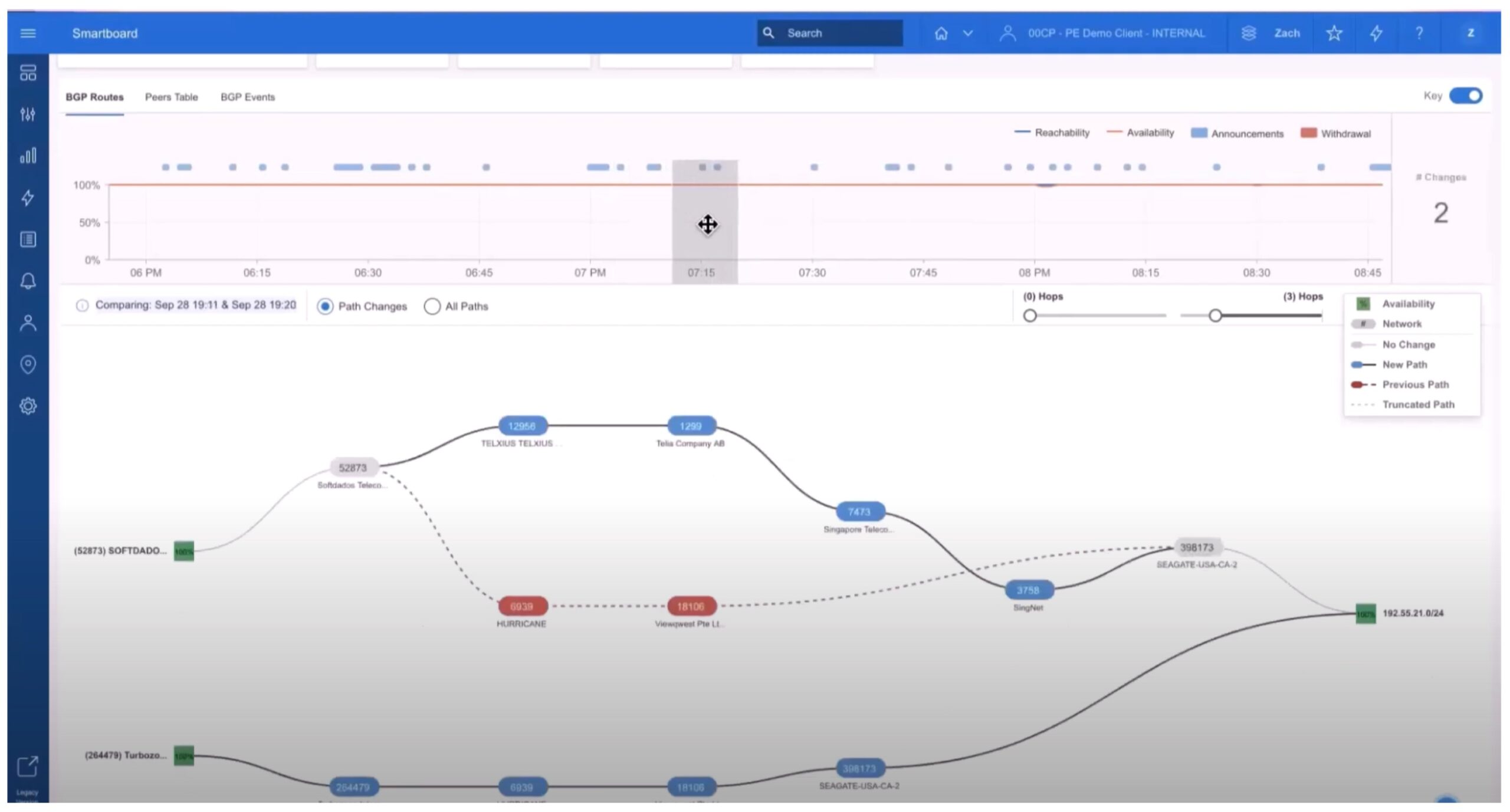 - Withdrawn and restored routes – track which routes vanish and come back: which routes are no longer reachable, or are flapping (disappearing and re-appearing from BGP tables).
