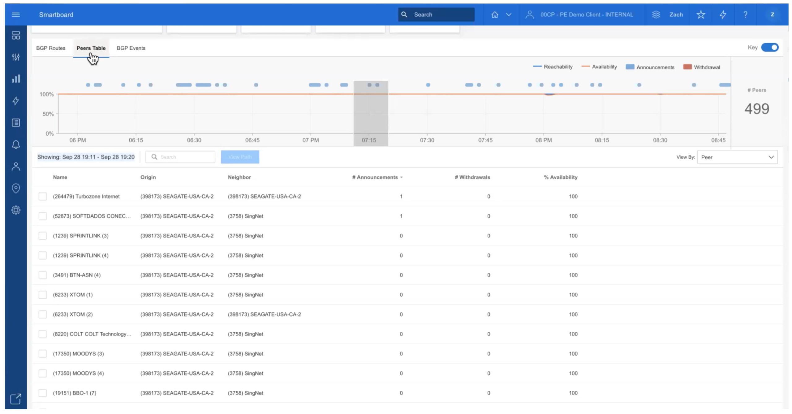 If you like, you can click on the “Peers Table” tab (up top left) to see data per-peer for the selected time interval. This is show below.