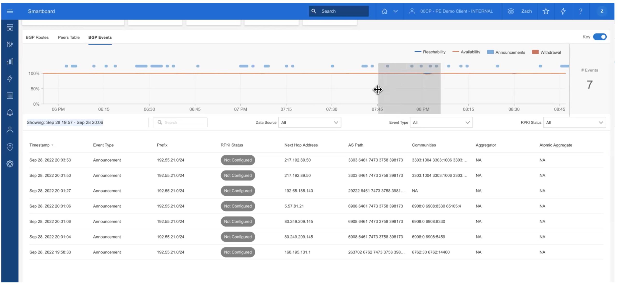When troubleshooting or monitoring, it can be helpful to see what has been happening from a BGP protocol perspective: BGP events. This is the third tab (top left).