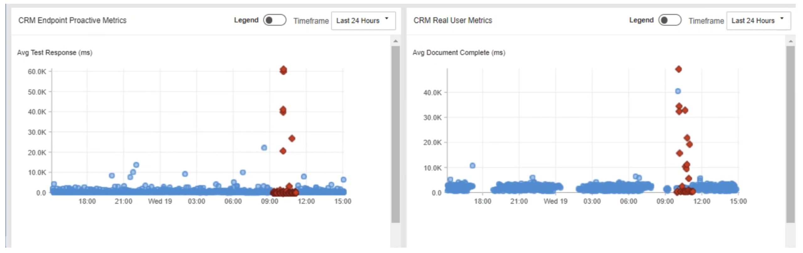 The bottom left tile shows synthetic monitoring from the end user device, the next tile to the right shows actual real user experience as rendered in the browser. If you home in on the time (x-axis), the left tile shows problem onset before the middle one: apparently there were no real users of the app at 9 AM.