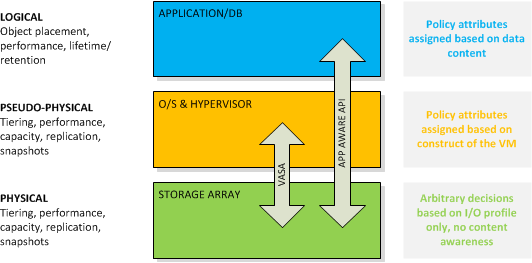 How could this be achieved in practice? Today with VVOLs and storage for VMware virtualisation, an array advertises its capabilities through the VASA (VMware APIs for Storage Awareness) interface. This feature could be extended to allow applications to query array capabilities and assign policies directly to data objects as discussed above. The move to place more application intelligence in the array has already started, with some vendors looking at container technology to achieve this.