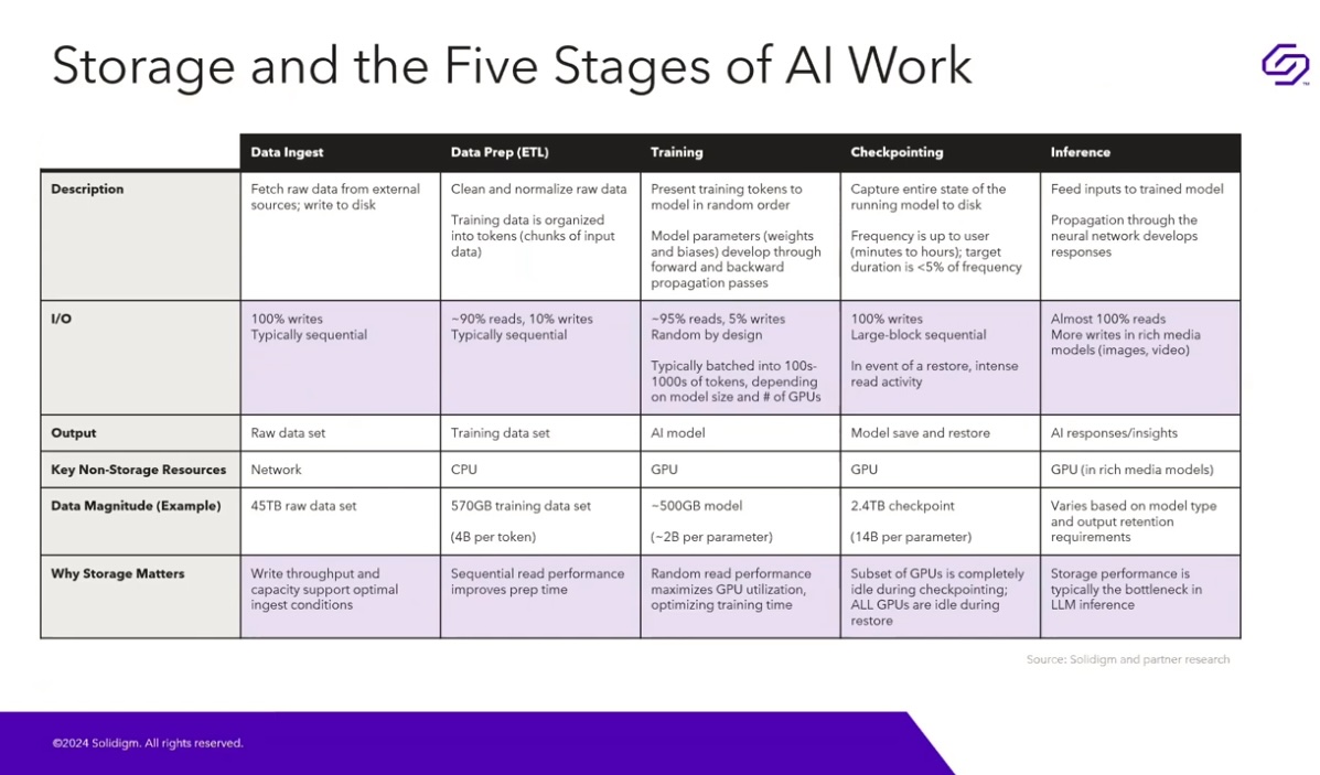As it turns out, SSDs are inherently advantageous for AI workload. Superior to HDDs for handling diverse throughput demands like prolonged sequential read/write, during data ingestion and transformation, they also provide long-term high-capacity storage volume. As a result, they make a better choice for the intense demands of random read/write activity while training, checkpointing, and delivering insight for LLMs, ensuring that those hungry GPUs keep consuming data.