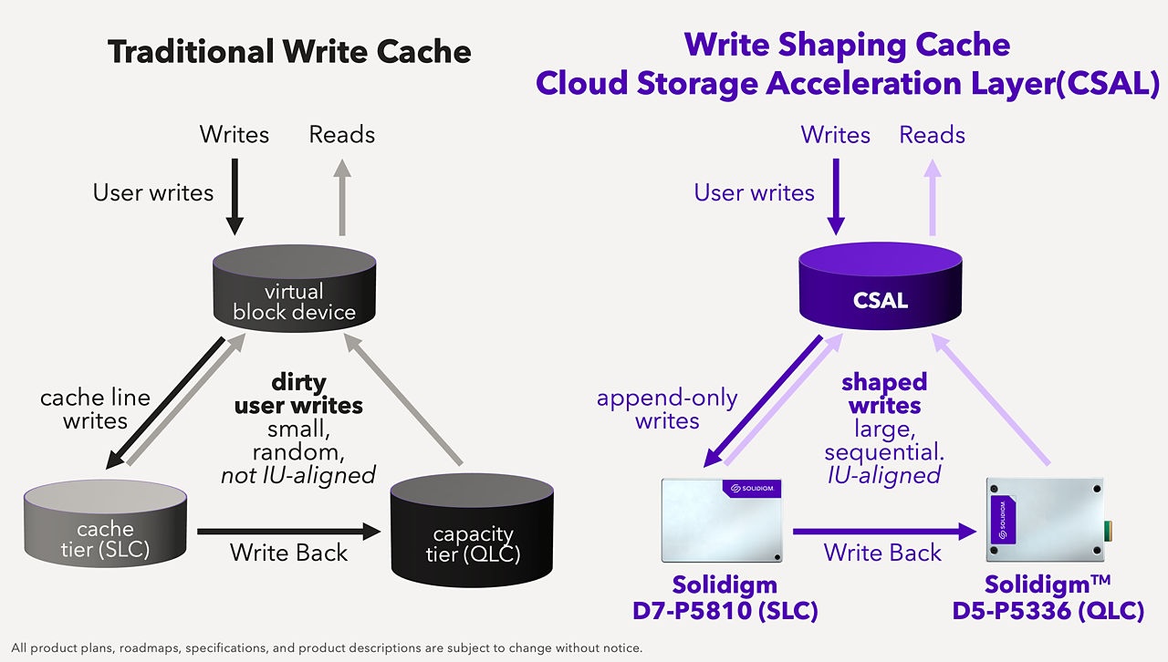 Solidigm’s Cloud Storage Acceleration Layer (CSAL) software acts as the cherry on top. CSAL is an open-source software that provides write-shaping – in essence, sequentializing that I/O – via extremely fast write buffers within storage class memory (SCM) SSDs before the incoming data stream is eventually written to higher-capacity QLC SSDs. Since SSDs do eventually “wear out” from write activity over years of use, serializing the I/O patterns increases their lifespan without compromising on the workload performance demands.