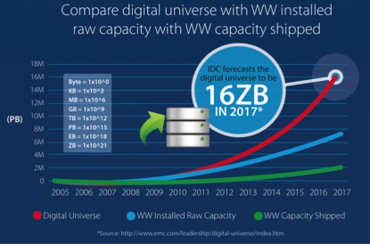 For a number of years IDC (sponsored by EMC) have been producing a report showing the growth of data with projections into the future to around 16ZB per year in 2017 and 44ZB by 2020. For the uninitiated, a ZB or zettabyte is 1021 bytes or 1 million petabytes. Put it another way; the 44ZB we create in 2020 will require around 7 billion hard drives to store in today’s capacity terms.