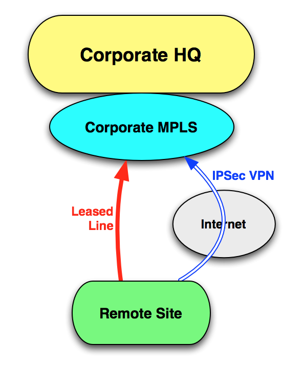 Often, centralized internet access policies mean that there is no split VPN tunneling locally and all traffic must go through the corporate HQ. The Internet link is usually there purely as a backup mechanism in case the leased line fails. In terms of configuration the simplest case would have a static default route via the leased line, then a floating static default route is configured, pointing via the IPsec tunnel. There are a few obvious issues with this solution: