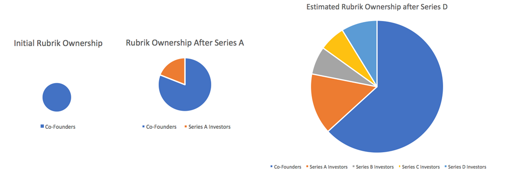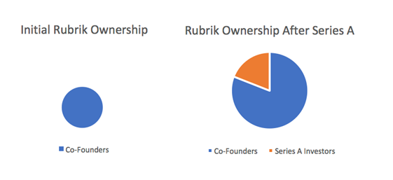 Rubrik identified a problem in the backup market. Backups were too complicated and they should be easier to manage. They came up with the idea of a scalable backup solution that was easy to use. At that point investors were probably not knocking down the doors to hand these people money. Other than identifying a problem and having an idea to fix it, they had nothing yet. To get going, they needed to put in some work to prove that they had a viable product. One person can’t do this alone, so a group of people got together to put in some of their own time to build the product. They were earning equity in the company through their own sweat and likely their own money. These are the co-founders of the business, and between them they own all of a very small pie. How big is the pie? Well at this point we don’t know, there wasn’t really a product yet, but they owned all of it.
