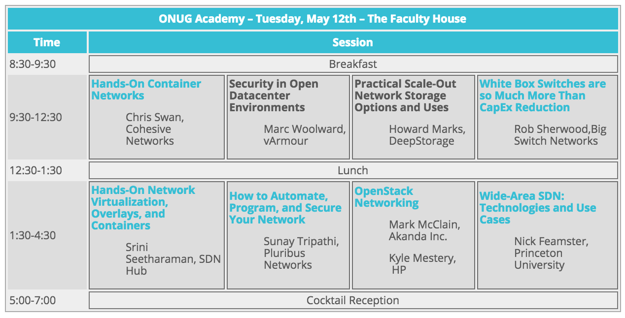Day one (May 12th) of the ONUG event is the ONUG Academy. This is described as being “hands on tutorials” in a number of areas. Here’s the schedule showing the topics covered: