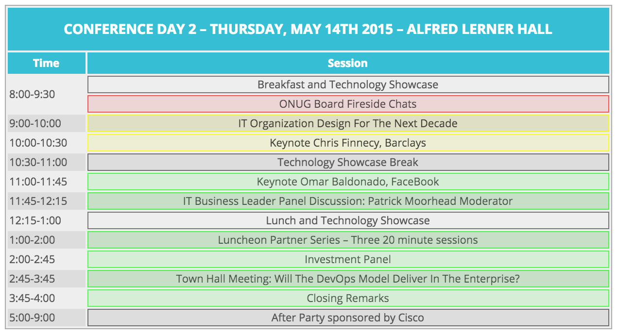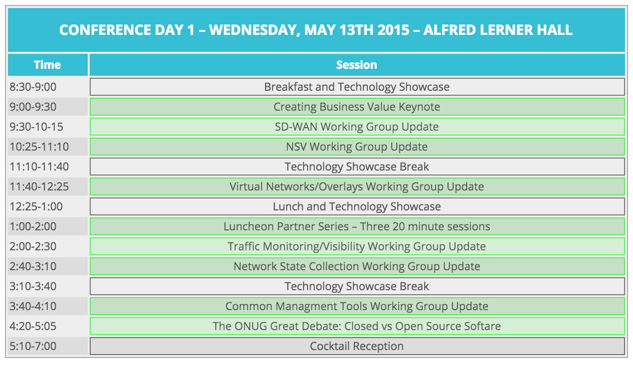 Days two and three of the ONUG event are the ONUG Conference. This schedule looks exhausting and each day is packed with sessions on a wide variety of topics: