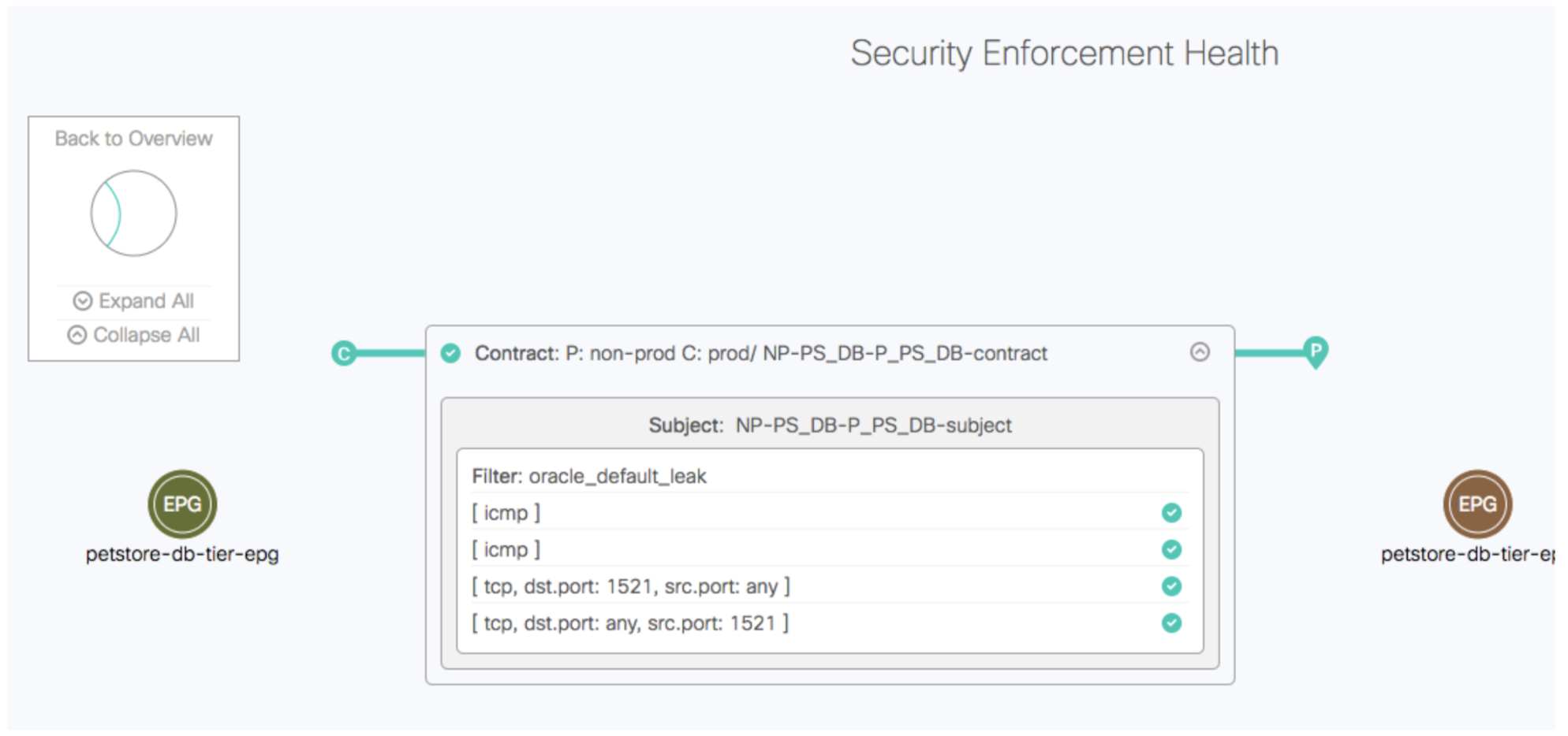 Cisco NAE extracts information from both the ACI network controllers and the actual network configurations and state, so it has insight into both the planned connectivity and the actual one. One of the highly effective visualizations NAE produces shows the contracts in place between end point groups (EPGs) in ACI, as well as their enforcements down in hardware. In the example below, it should be clear that all EPG connectivity stays within the same tenant (e.g. between EPGs in prod, and between EPGs in non-prod).