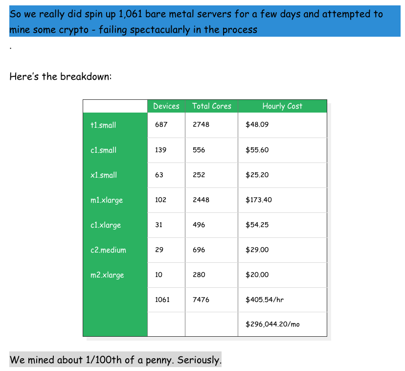 If nothing else, this serves as a helpful PSA: don’t mine cryptocurrency with a CPU. Even when you own a bare metal server business, and can throw a comical amount of cores at a joke currency, it just doesn’t pay.