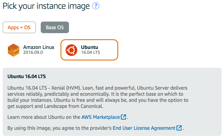 At least for the WordPress install, it sets you up with a server running Ubuntu 14.04.5 LTS. I’m assuming it would be the same for the other instance images. You also have the option of just starting up a base install of an OS. Amazon claims to have “your favorite operating system” options to choose from, but the choices are slightly more restrictive.