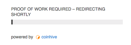 Coinhive offers a number of ways to do this. One is support for shortlinking. Instead of using bit.ly or another service, Coinhive provides a short URL. When clicked the client computer has to solve a “proof of work”, essentially solving hash functions as part of a mining pool. This can be customized from as low as 256 hashes with no upward limit (other than patience). Users are greeted with this while they wait for their site to load: