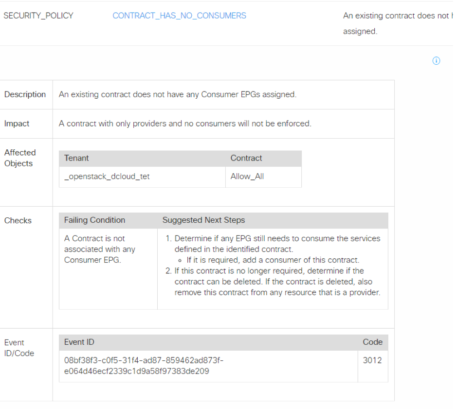 Being compliant to pass security audits is only part of what is necessary to manage security in a datacenter. Network security policy sprawl adds risk to the network. NAE can help, with built-in checks, to identify incompletely specified policies, unused policies, and duplicate intent (in the form of overlapping or conflicting contracts between EPGs), then listing them in the dashboard as Smart Events.