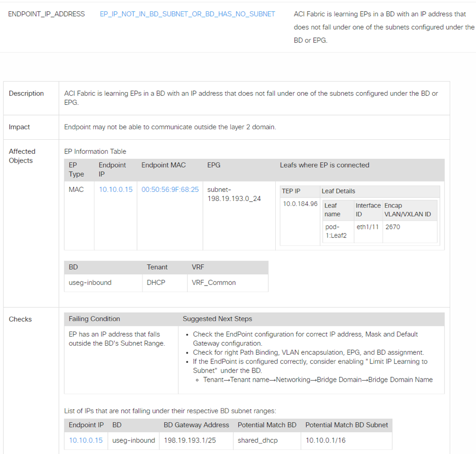 A quite common example of a problem on an Endpoint is wrong addressing. NAE can notice an Endpoint is assigned to the wrong or missing subnet and generate a Smart Event with all the details necessary to fix the issue: