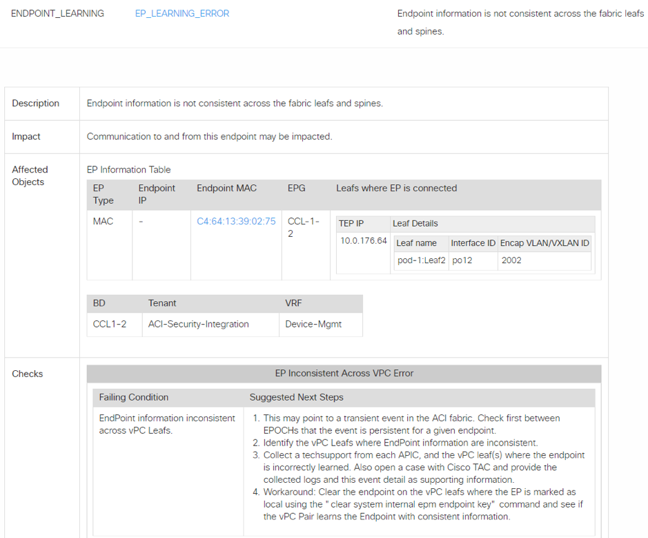 If for some reason Endpoint information is not consistent across the fabric leaves and spines, NAE can detect this condition and provide all the details necessary to investigate: