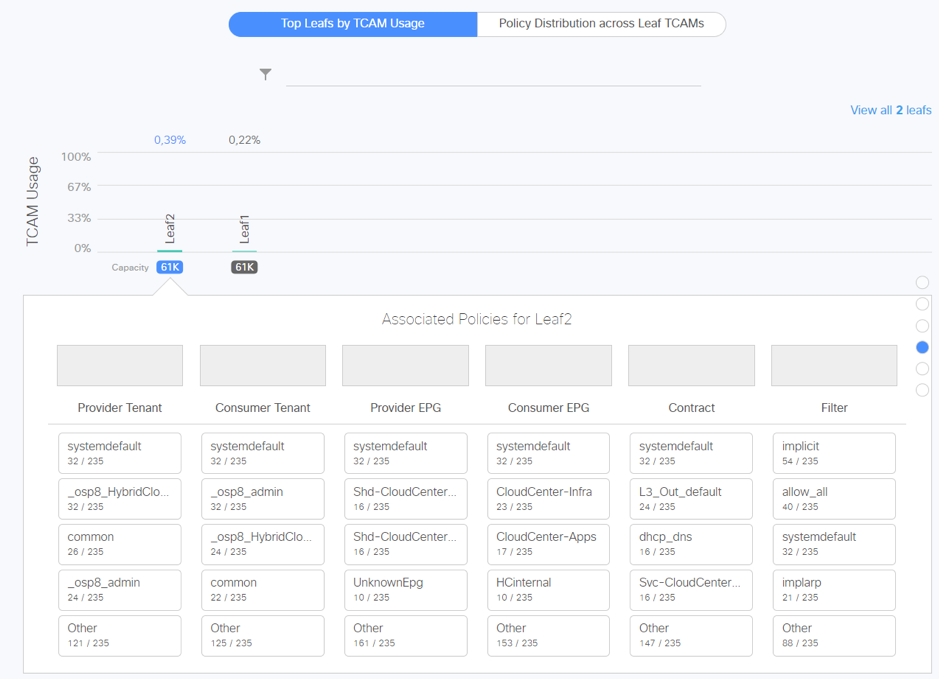 With this information the network administrator can take actions like move a tenant to another leaf with spare resources or plan hardware upgrades based on the actual use of TCAM.