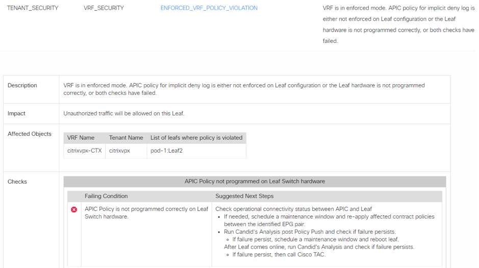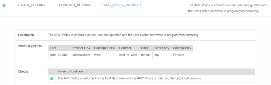 Following the “trust but verify” paradigm, Cisco NAE can ensure security policy enforcement is correct at the leaf configuration level and leaf hardware level for the whole fabric.