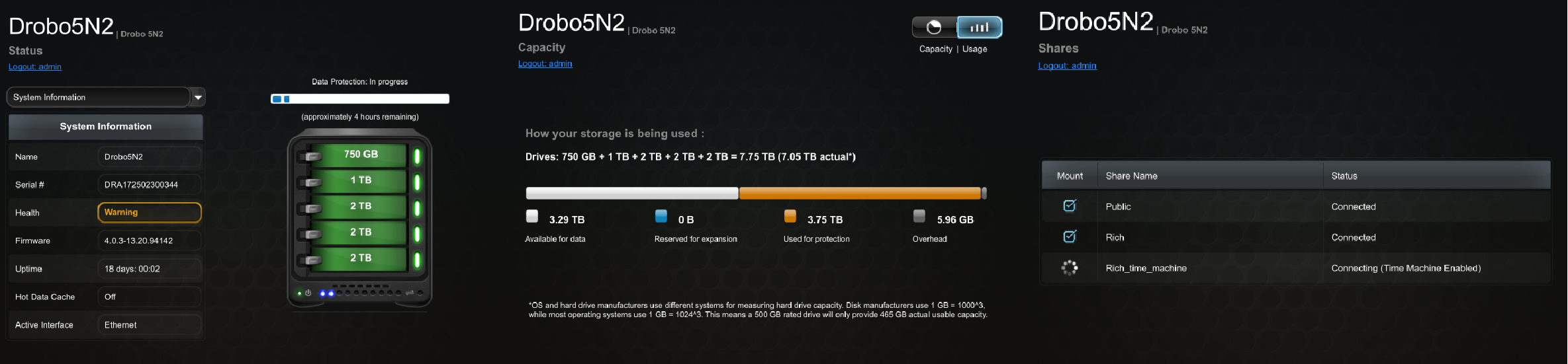 Once you’ve setup the admin account, the Drobo is good to go. You can probably get the entire device from in the box to usable in well under an hour.