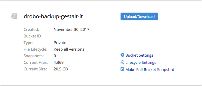 I’ll be honest, it’s far from a seamless experience. For one, CloudBerry isn’t free, costing $29.99 after a free trial. For that cost, there’s one key limitation, you’re limited to a single network share for backup, no matter how many backup plans you schedule. It’s weak sauce. This isn’t Drobo’s problem, but without having a similar offering out of the box (one that isn’t tied to a specific cloud storage provider), users are just kind of left on their own. On a positive note, the B2 storage performed reasonably well on the single network share. Backblaze has expected controls in place in terms of bucket sizes, bandwidth limits, with helpful notification settings to make sure your NAS isn’t racking up an unexpectedly high bill.