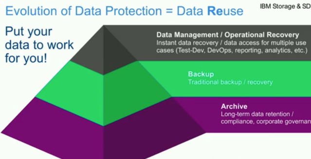 According to IBM, reuse is the evolution of data protection, and I fully agree. The ability to gain value from all of the data we have in an organisation is crucial for a data driven business, and this includes our “backup” data. The ability to make it available for other tasks like DR, dev, analytics, or reporting has great value.