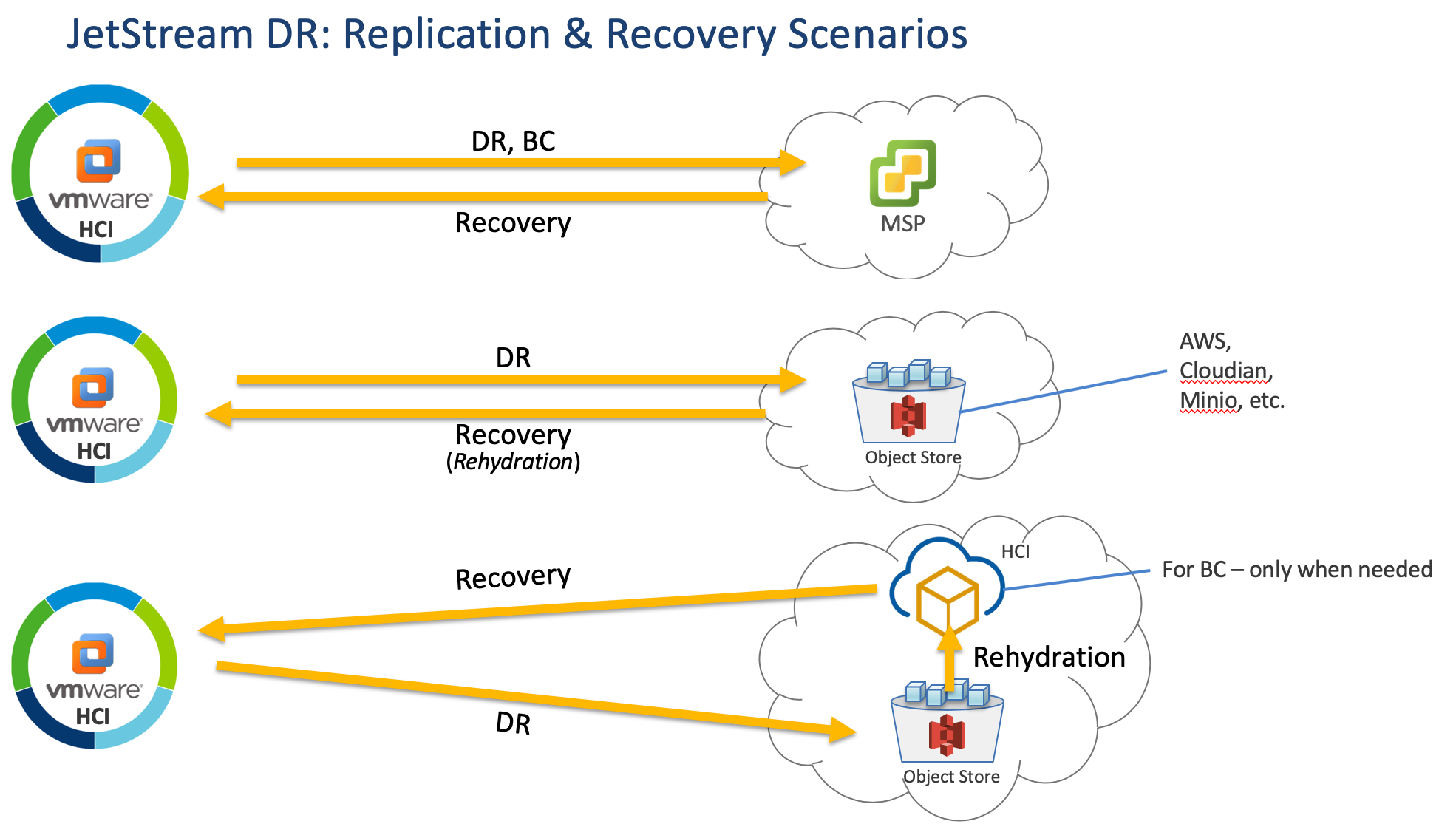 JetStream DR customers have multiple options for application protection and recovery including independent service providers, S3 compatible storage, and recovery from S3 to VMware Cloud on AWS.