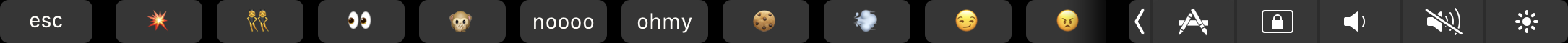 Soundbar is a customizable soundboard that lives in the Touch Bar. It’s really the only app that I would consider “useful” for anything resembling work. I’ve done enough podcasts to know that having sound cued up is always a bit of a pain, but the Touch Bar puts it nicely in front of you. By default, most of the clips are pretty good too. You get an Inception sound, an Price is Right fail horn, Darth Vadar shouting “Nooooooooo”, and a George Takei “Oooooh Myyyy”. Plus a bunch of ones in what I believe to be German. Added to this, you can load in your own MP3’s to really make it your own. Imagine, your dream of being a drive-time radio producer can finally come true!