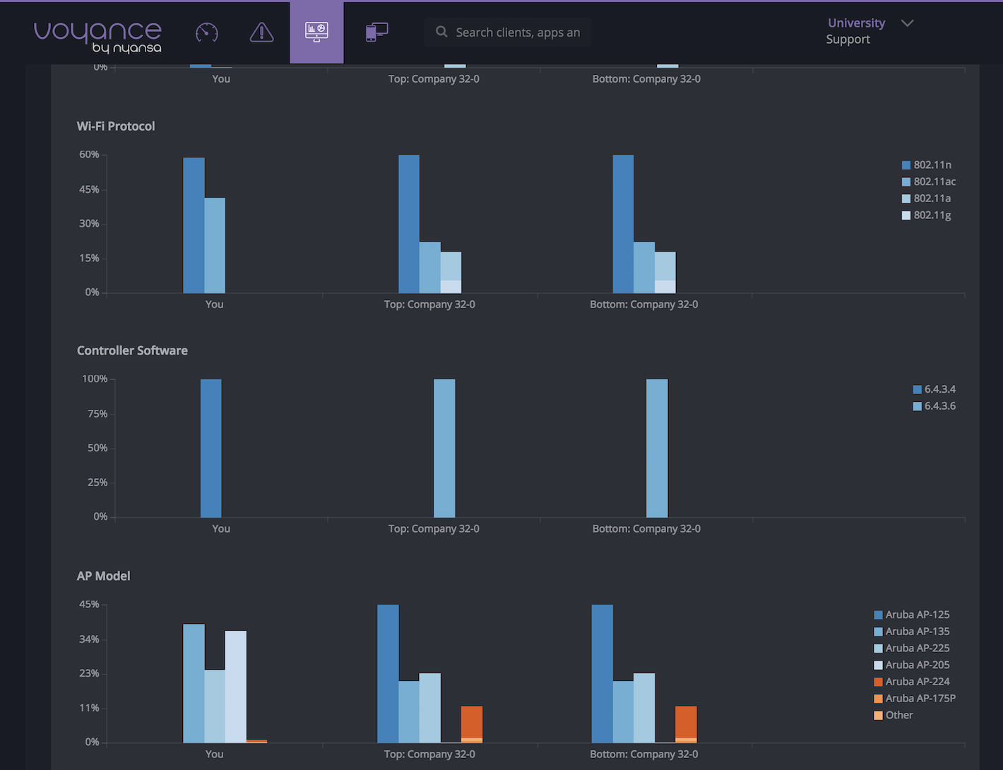 But comparison can also be a powerful tool. When framed against your peers (instead of a superstar athlete who happens to share your age), it can show you how something is relatively performing. In enterprise IT, it’s easy to get caught up in absolute metrics. We all have targets of how many IOPS we need, or how much latency is too much. But comparative metrics are also important. It would be nice to know if with an identical network setup, someone is getting substantially better performance overall. If nothing else, this give you an idea of where to start looks when problems come up. Most network monitoring and analytics focus on raw numbers without a comparison context. Nyansa’s Voyance solution puts it front and center.