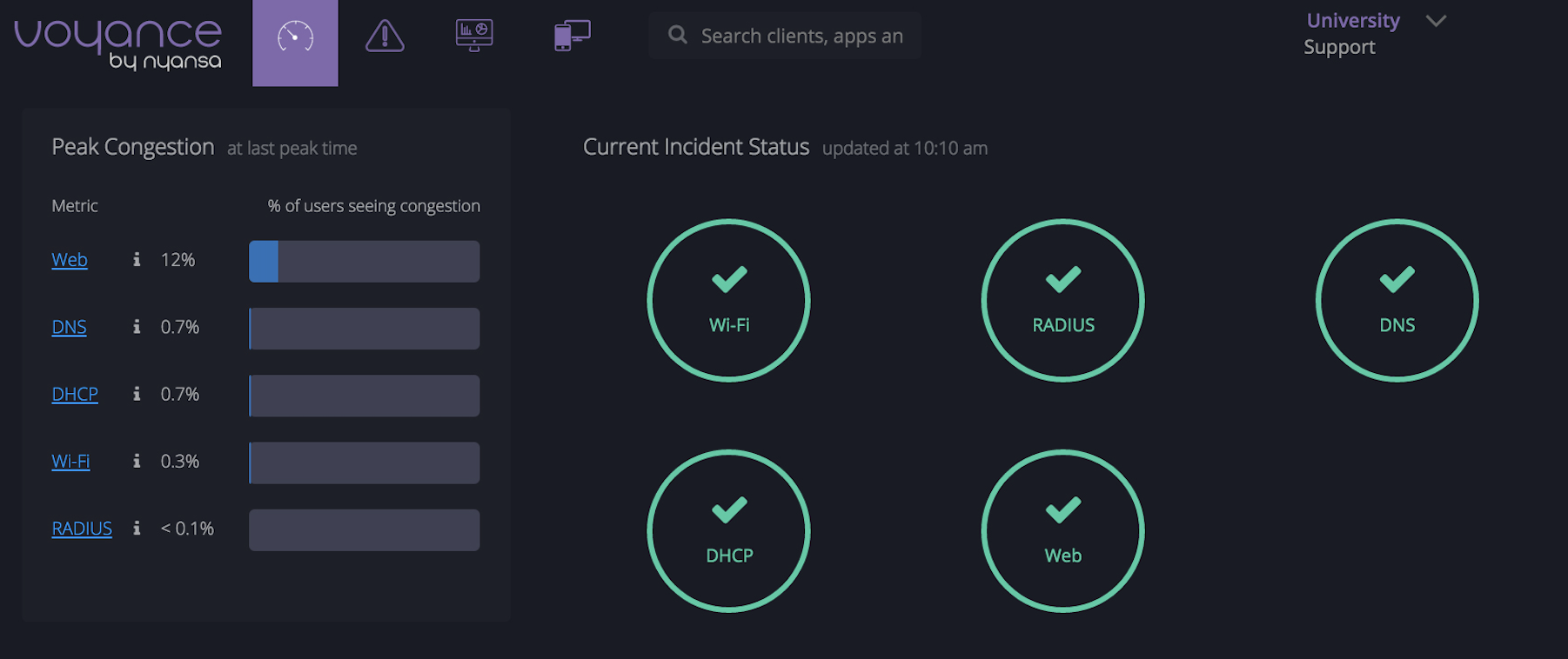 Nyansa isn’t in the business of remediation with Voyance, but it is doing some interesting things to find problems. Problematic clients that are performing poorly are sorted into their own section in the dashboard. This is then analyzed, with the potential causes listed in terms of their probably given its specific conditions. Again, this isn’t going to eliminate troubleshooting, but it’s definitely a great sorting tool, and should save a lot of time ignoring issues that’s can’t have come up.