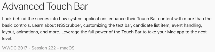 But that was about the only application highlighted as having Touch Bar support. The only other mention I found of it is a session called “Advanced Touch Bar“, for developers at the event.