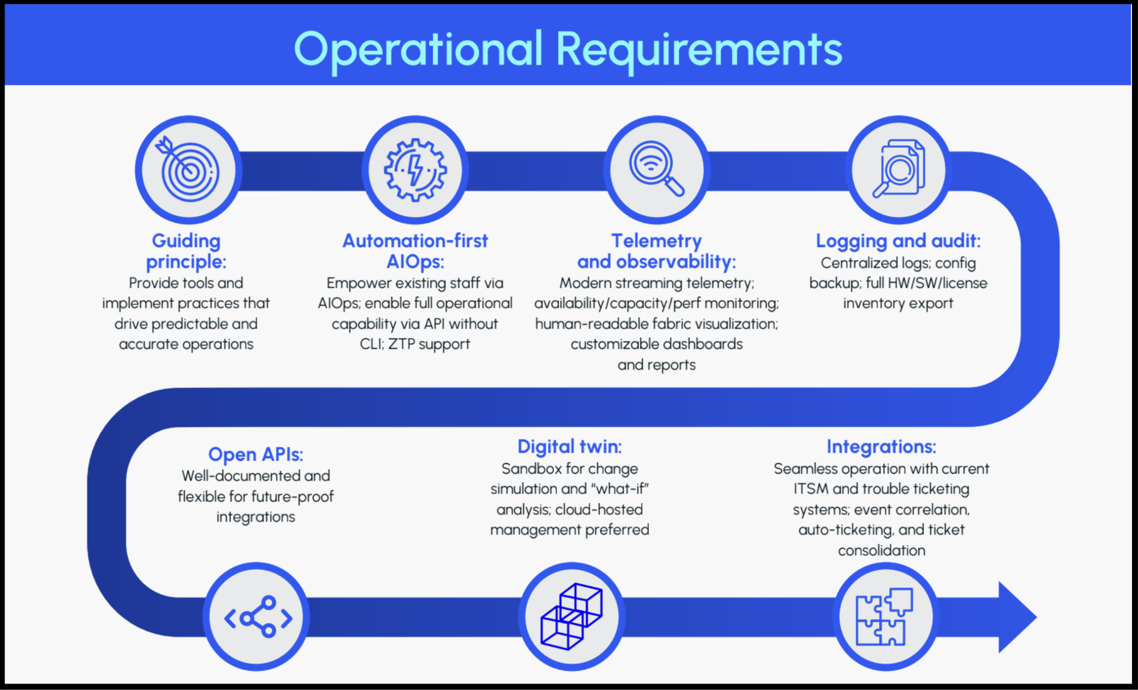 In conclusion, the operational requirements of automation, AIOps, observability, open APIs, and digital twin capabilities are all about achieving accurate, predictable, efficient outcomes in network operations. They represent a shift from manual, ad-hoc operations to systematic, software-driven operations. This shift is happening because the cost of not doing so is simply too high: human errors, slow responses, and siloed tools translate to downtime and lost opportunities. Conversely, an automation-first, intelligently observant network operations model yields the dual benefits of higher reliability and lower operating costs – precisely the alignment of IT goals and business goals that modern enterprises seek. As you assess your own data center network, consider these emerging requirements not as wish-list items but as crucial components of a strategy for resilience and agility.