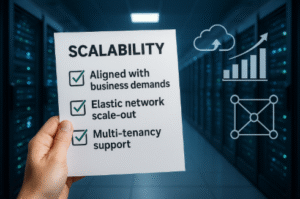 Hand-in-hand with reliability is scalability – the ability of the network to grow and adapt seamlessly as business demands evolve. In the era of cloud computing, AI, and digital business, data center networks must accommodate constant growth in traffic and rapid shifts in workloads. The checklist infographic stresses scalability as being “aligned with business demands,” enabling elastic network scale-out and multi-tenancy support for growing environments. This reflects a strategic priority: data center networks should never become the bottleneck to expansion or innovation.