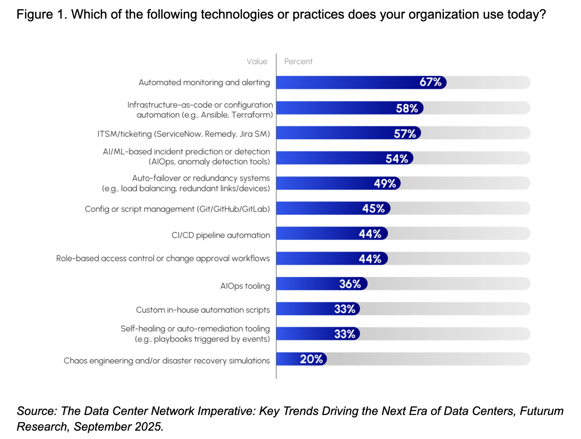 Today’s data center teams are doing less clicking and more coding. In a recent study conducted by Futurum Research, in partnership with Nokia, the results make one thing clear: the era of purely manual data center management is over. Nearly every organization surveyed has implemented at least one modern NetOps automation practice. In this post, we’ll explore the rise of automation and AIOps (AI-powered IT operations) in data centers. Why are so many IT pros investing in automation tools? Because with growing complexity and uptime demands, automated and AI-driven operations are fast becoming the only way to keep networks efficient and reliable.