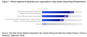 Hybrid is no longer a buzzword – it’s the reality for modern data centers. In a recent study conducted by Futurum Research, in partnership with Nokia, almost every IT organization surveyed reported using a mix of on-premises and cloud infrastructure. In fact, 79% of respondents operate on-prem data centers for internal needs, and 65% also leverage public cloud services (see Figure 1). This means the vast majority of enterprises now run hybrid environments – combining private and public infrastructure to meet their requirements. It’s a logical evolution: Certain workloads remain on dedicated enterprise servers, while others take advantage of cloud scalability and services. The result is a “best of both worlds” approach that has become standard in data center strategy.