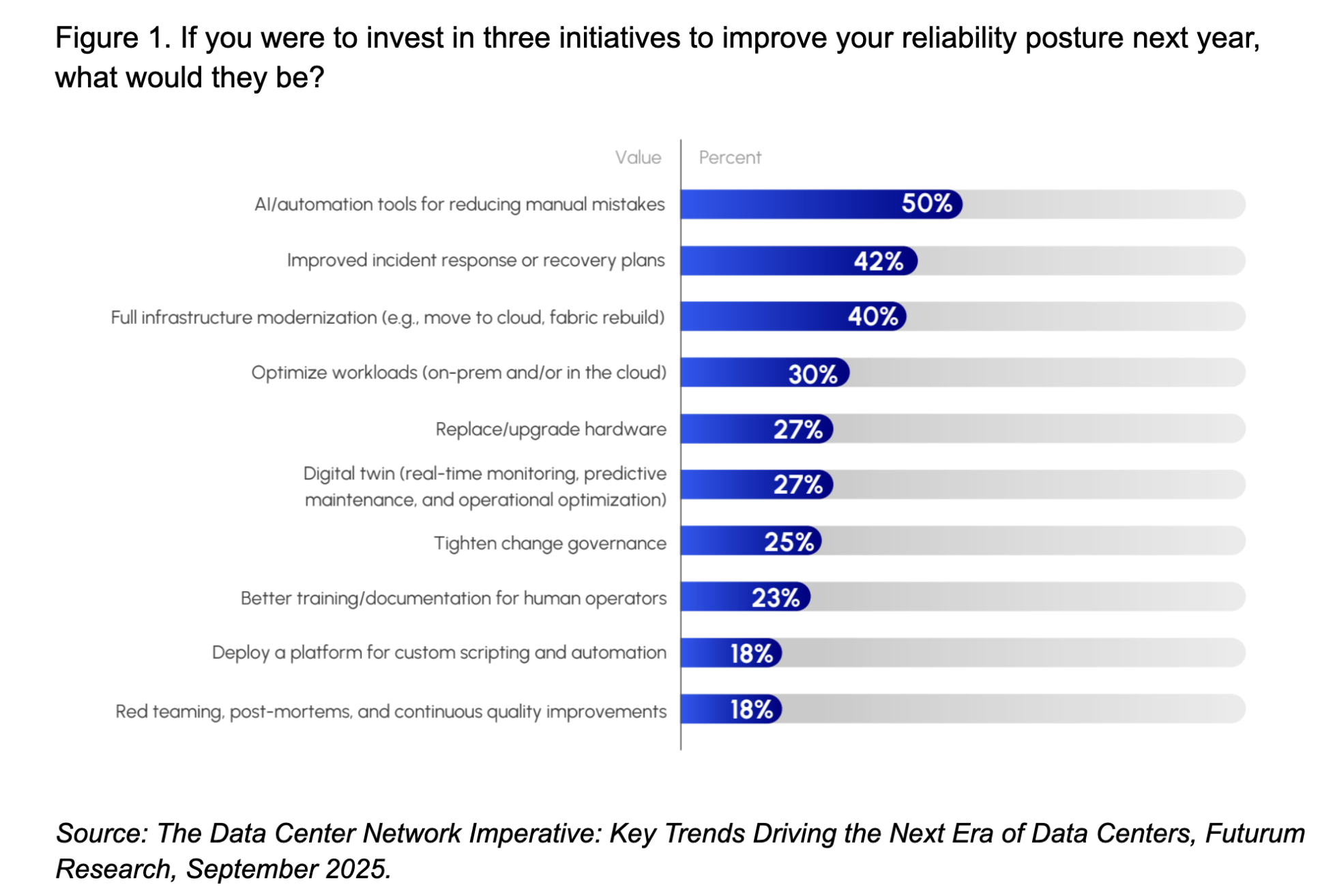 IT leaders aren’t just talking about reliability and modernization – they’re putting money behind it. In a recent survey by Futurum Research, in partnership with Nokia, organizations were asked what their top investment priorities are for improving data center reliability in the next year. The answers echo all the themes we’ve discussed: automation, resilience, and modernization. In this final post of our series, we’ll break down where enterprises are focusing their next round of improvements. Consider it a roadmap for a future-ready infrastructure: from advanced automation tools and incident response plans to ripping out legacy hardware, these are the areas getting the attention (and budget) of CIOs and data center operators.