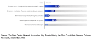 How do IT leaders approach the human factor? The survey presented several philosophies and got a fascinating split of responses. The most common stance (35% of respondents) was “prevent errors through strict process discipline and training” (see Figure 1). These are the folks who believe in rigorous change management, detailed runbooks, checklists, and peer reviews—essentially, if people follow the right process and are well-trained, mistakes can be minimized. It’s a very process-centric, human-driven approach to reliability.