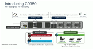 StackPower+ is available with the Catalyst 9350 and it’s a 55V power-sharing architecture that allows the stack of power supplies to act as one load. The stack gets redundancy, efficiency, and real-time demand sharing. By adding just one power supply to the stack the capacity is increased for all members. Now that all switch stacks are expected to always deliver 60-90W on all ports, the numbers ramp up fast on power supply needs. Up to four of the Catalyst 9350 switches can be connected in a StackPower+ ring.